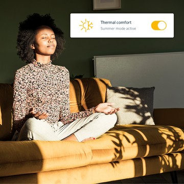 Doprajte si pokojný začiatok dňa. Zatiaľ čo sa závesy roztiahnu a vpustia dovnútra denné svetlo, vykurovanie sa prepne do komfortného režimu.
